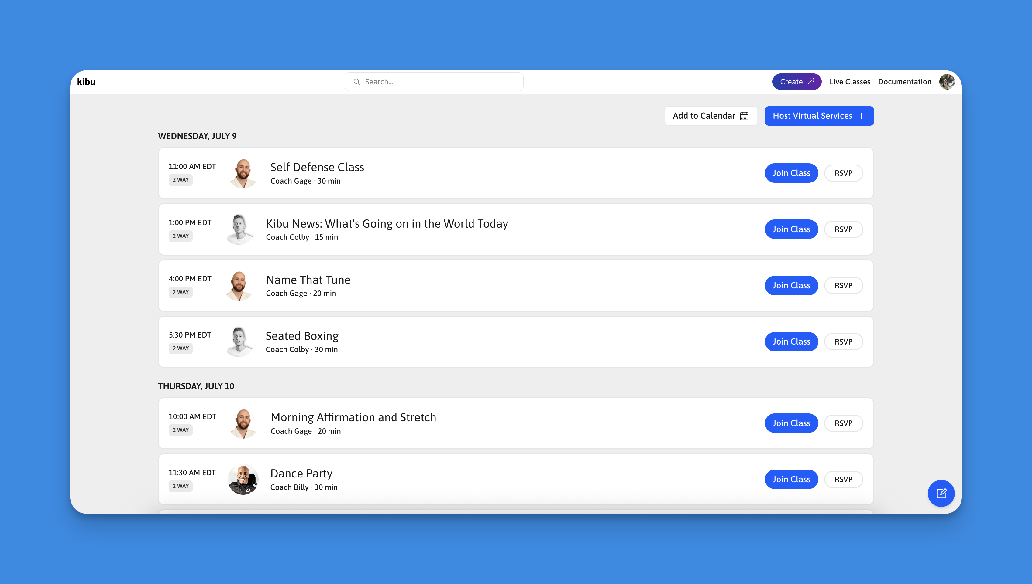 View our complete schedule and RSVP In Kibu for upcoming sessions, or check out our public live class calendar. New classes are added regularly!Live classes are not recorded, so replays are not available. Be sure to join
