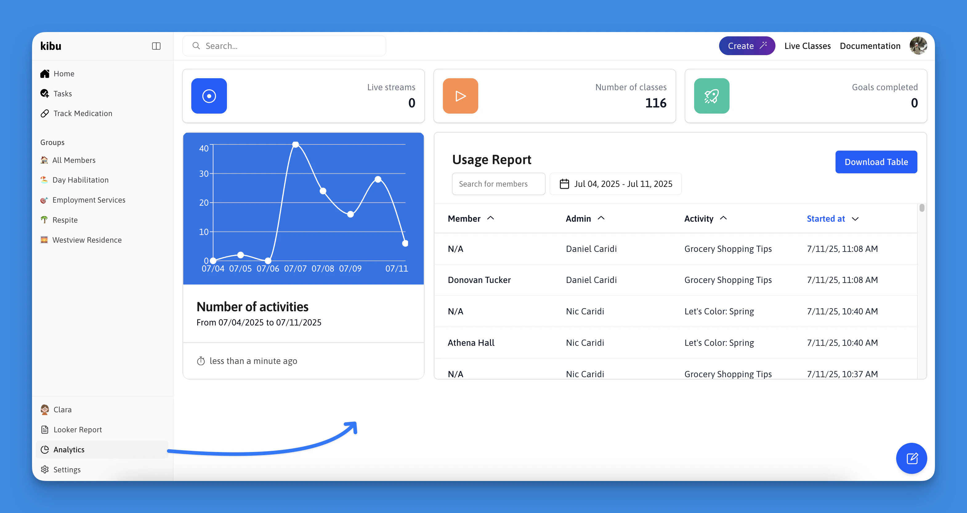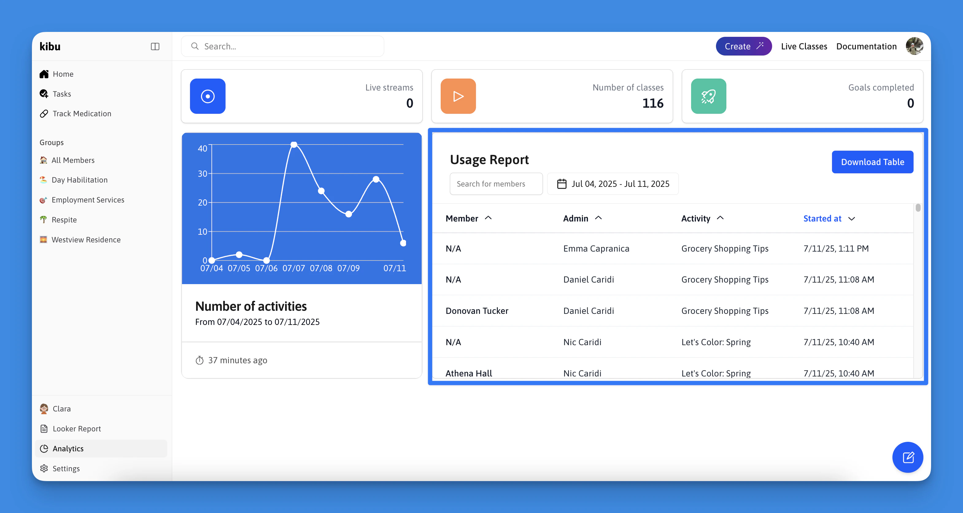 Kibu’s analytics dashboard provides detailed insights into member engagement and activity participation across your organization. This data helps you make informed decisions about programming, track progress, and generate reports for compliance and record-keeping.