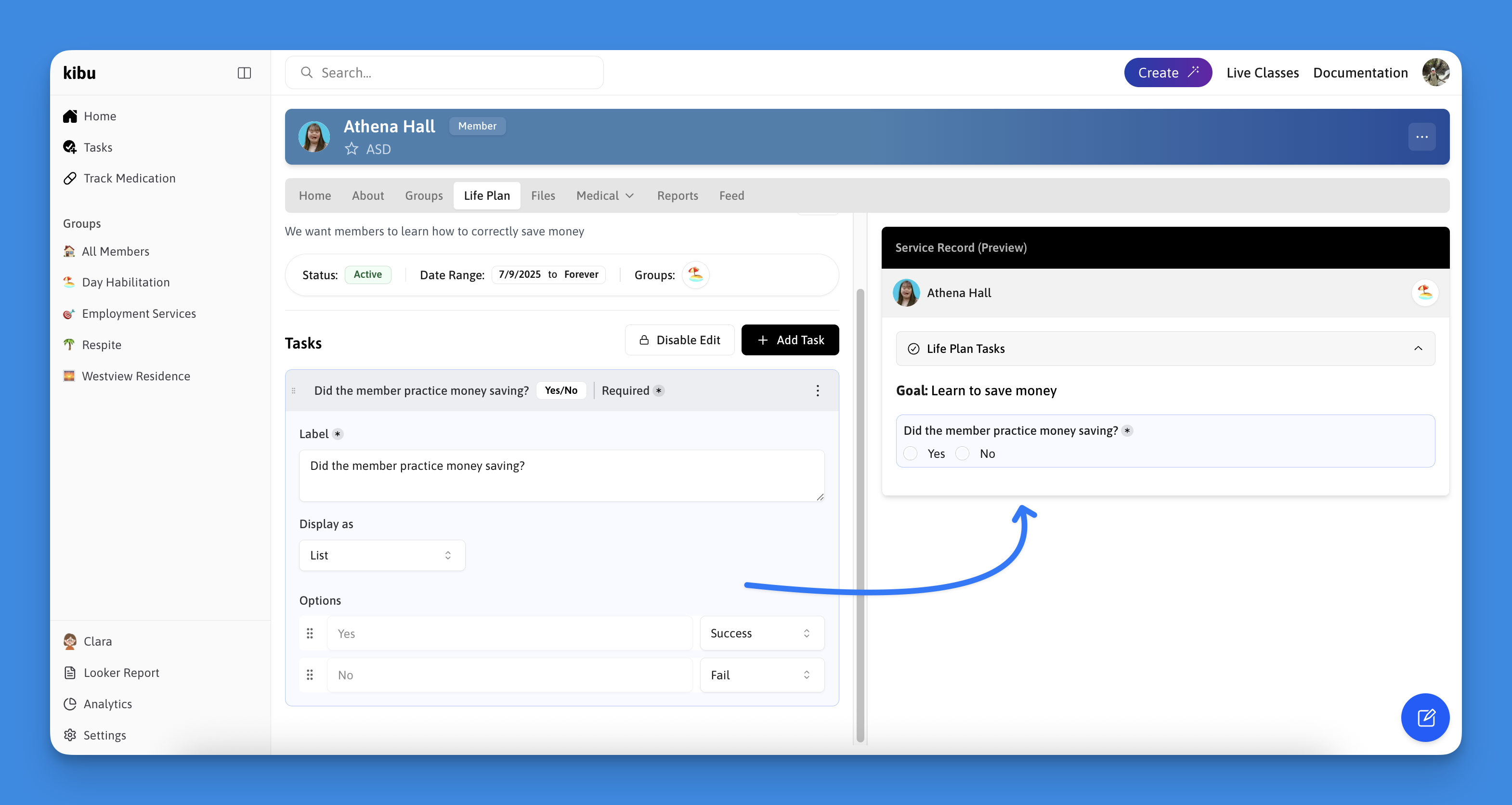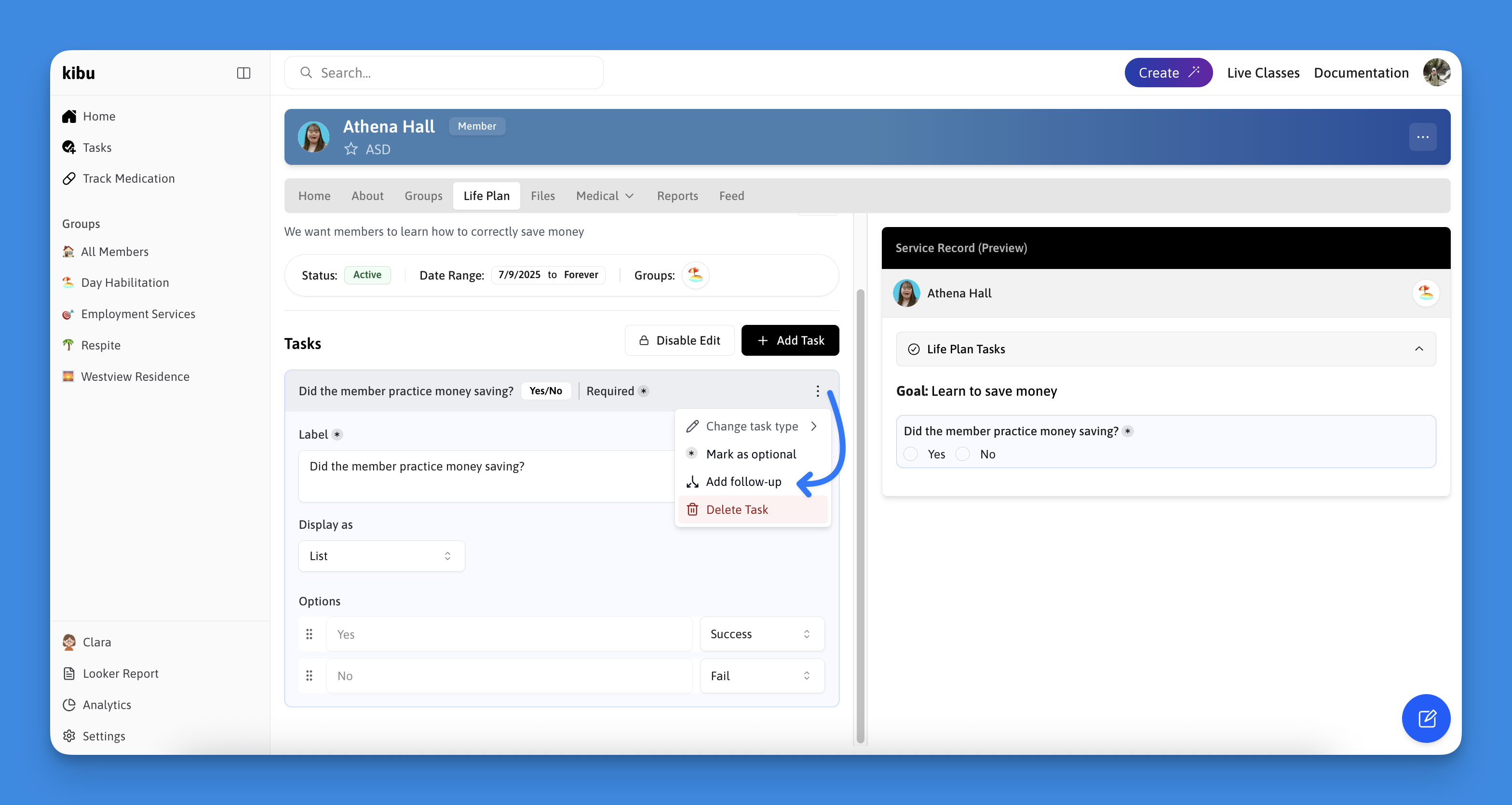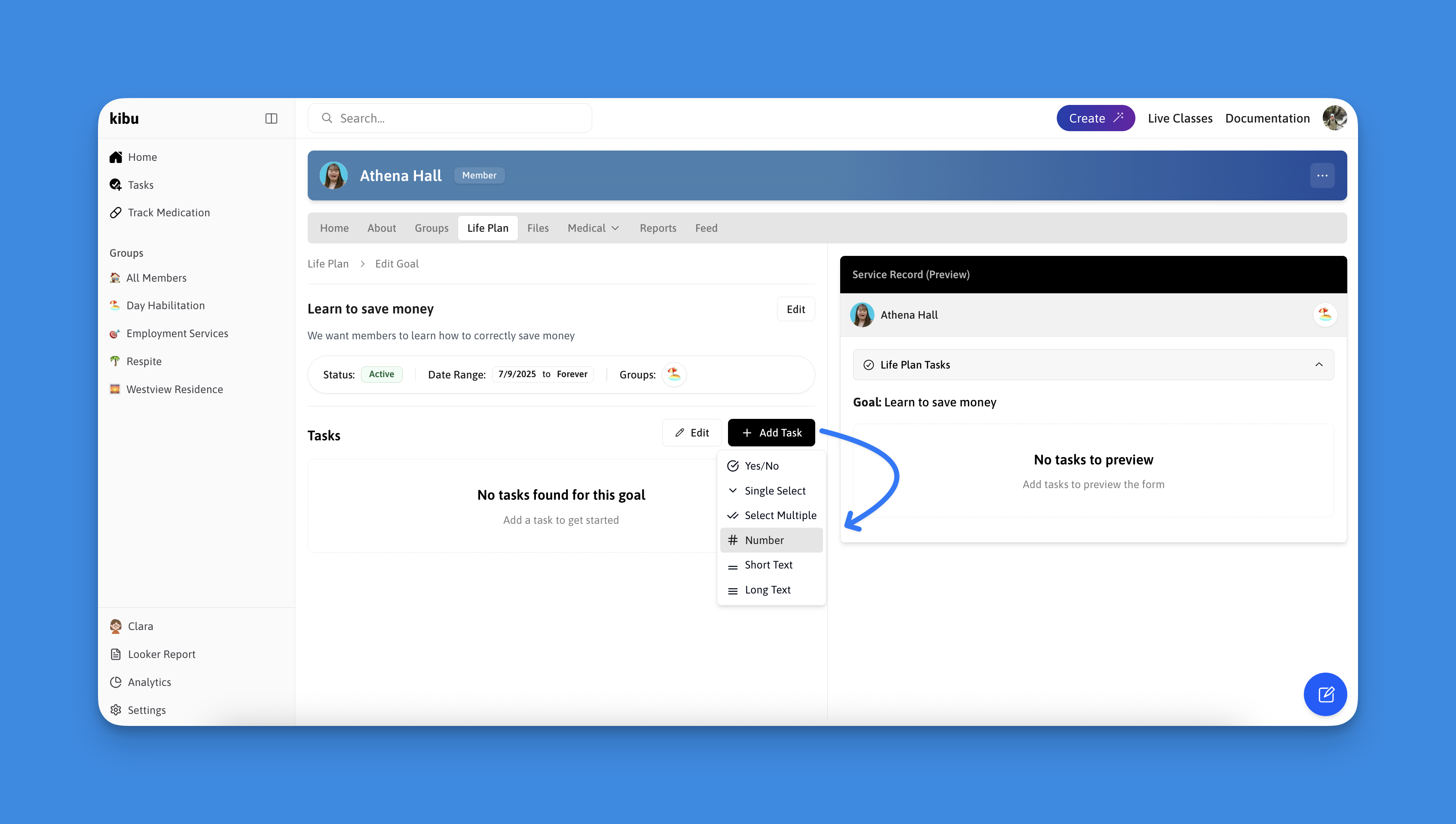 Create your initial goal questions by selecting Add Task and choosing from the task types explained above. These are the first questions a dsp will see when filling out a members service record for the day.