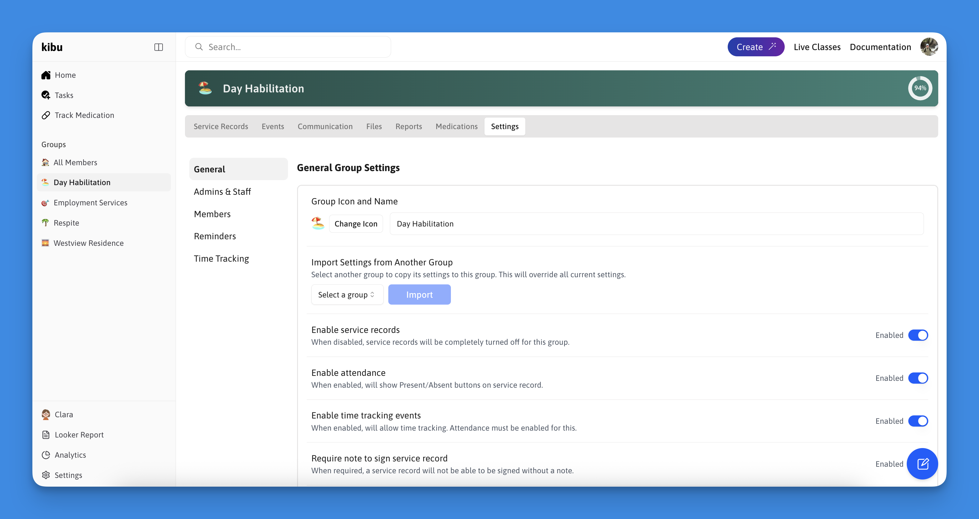 - Description: Controls the overall service record functionality for the group. When disabled: